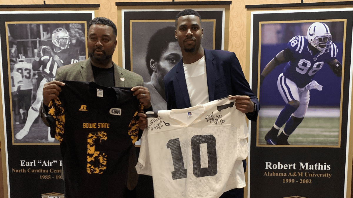 ATLANTA– Ahead of Saturday night’s Black College Football Hall of Fame inductions, two CIAA legends spent some time together in Atlanta. Earl “Air” Harvey and Amir Hall told a few stories and swapped jerseys on Friday night at the College Football Hall of Fame.