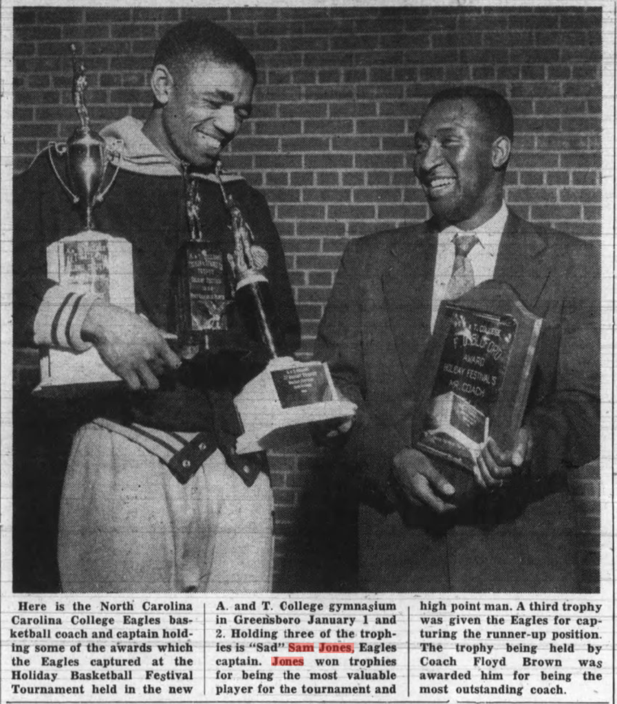 Though he didn’t expect to play professional basketball, news of Jones’ talents and exploits spread North to Red Auerbach, the famous coach of the Celtics. One story says Auerbach asked then Wake Forest head coach Bones McKinney who was the best player in the Atlantic Coast Conference (ACC). McKinney reportedly said UNC All-American Lennie Rosenbluth. But McKinney also told Auerbach that the best player in the state (N.C.) played at NCC, Jones.