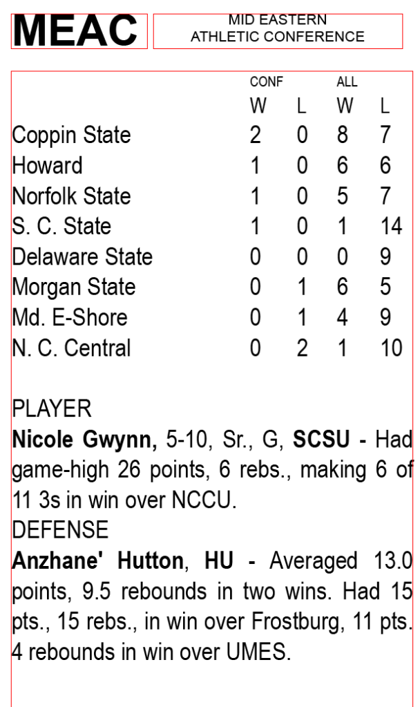 Coppin State (8-7 overall) got a win Wednesday to take over the top spot in the MEAC women’s race at 2-0. Howard (6-6), Norfolk State (5-7) and South Carolina State (1-14) all check in at 1-0 now that conference play has moved into full swing. COVID-19-related postponements and cancellations ruled the day before four MEAC games were played over the last week.