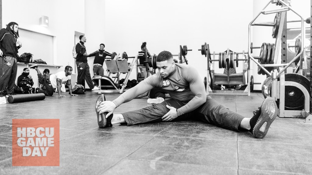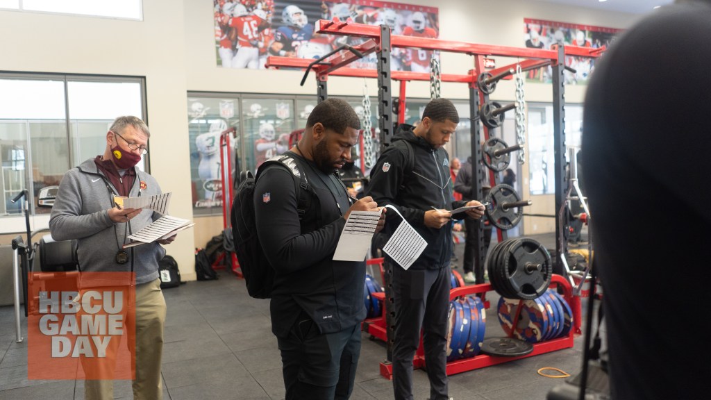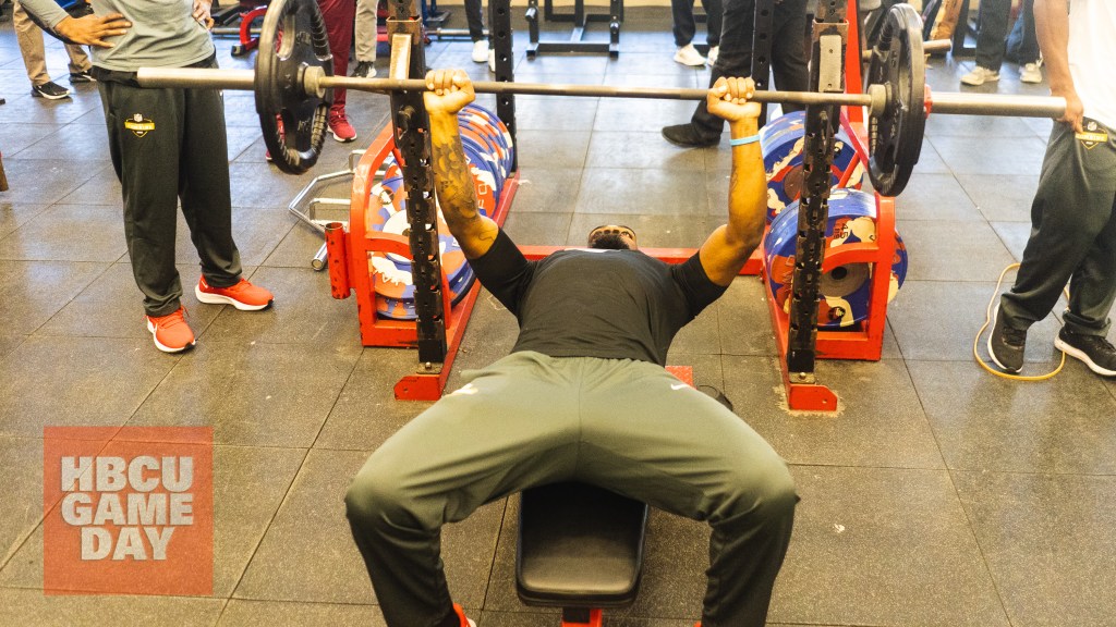 Workouts started at 8 AM with the bench press inside the locker room of South Alabama University, before transitioning to the FBS program’s sheltered facility outdoors. Unlike the NFL Combine in Indianapolis with a controlled atmosphere in an indoor facility, these HBCU players had to deal with the elements, with temperatures in the 40s for the duration of the workouts and a steady gust of gulf wind.