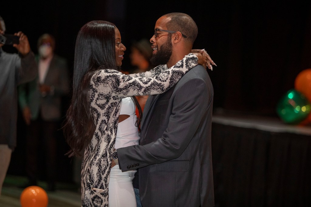Simmons’ wife Shaia then unveiled the surprise. FAMU’s Co-Defensive Coordinator Brandon Sharp had gotten married earlier in the day in a small private ceremony. He wed former FAMU track star Tiffiny Morrow, who was previously an assistant track and field coach for FAMU, winning several MEAC championships in cross country and two MEAC Outdoor Championships.