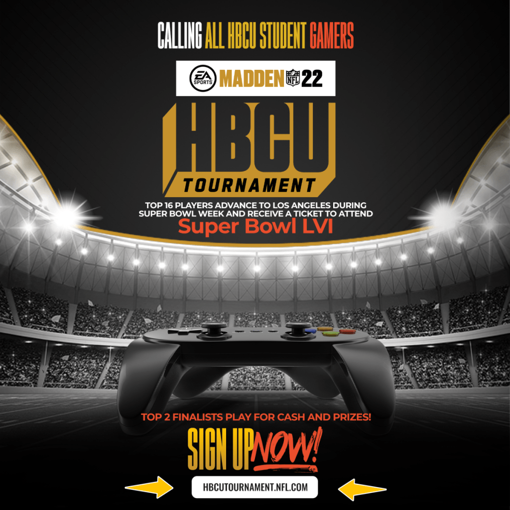NEW YORK, NY –The National Football League today unveiled its plans for the top HBCU student finalists who participated in the 2nd annual Madden NFL 22 x HBCU Tournament with a once-in-a-lifetime experience during Super Bowl LVI week. Students will journey to Los Angeles for a week filled with job shadowing opportunities and events with the NFL as well as the finals competition of the Madden NFL 22 x HBCU tournament. To conclude the week, each student finalist will receive a ticket to attend Super Bowl LVI, on February 13, 2022, at SoFi Stadium. The Madden NFL 22 x HBCU Tournament is driven by the NFL’s commitment to inclusivity and accessibility in both traditional sports and esports.