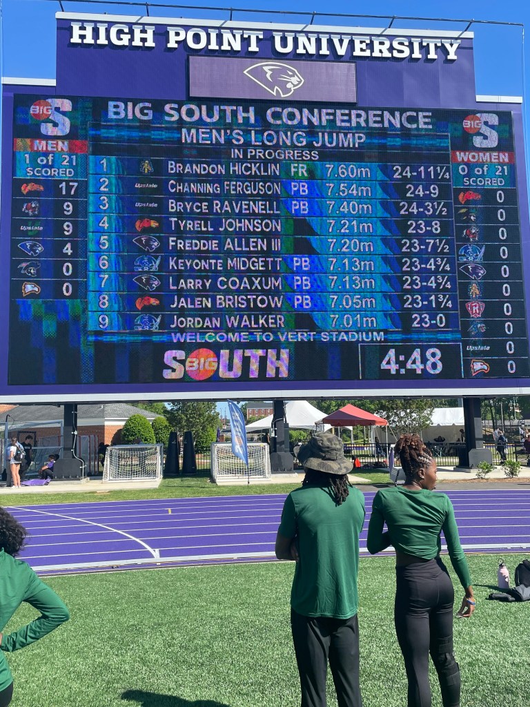Hicklin’s only good jump in the final round measured 7.6 meters (24’11 1/4”) and was good enough to win the competition. The jump was a new facility record. USC-Upstate’s Channing Ferguson had broken the facility record of 7.54 meters with a leap of 7.55 meters earlier before Hicklin topped that mark. Ferguson finished in second place.