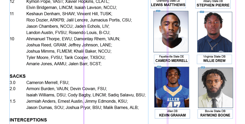 The charge on defense this week was led by Grambling linebacker Lewis Matthews and Fayetteville State defensive end Cameron Merrell.