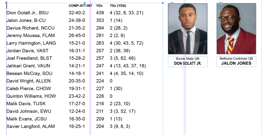 Bowie State quarterback and Morgan State transfer Dion Golatt Jr. topped the passing charts in games from Week Five. The graduate senior out of Largo, Md. hit on 32 of 40 passes. They went for a school-record 439 yards and four touchdowns in a big 69-0 win over Livingstone.