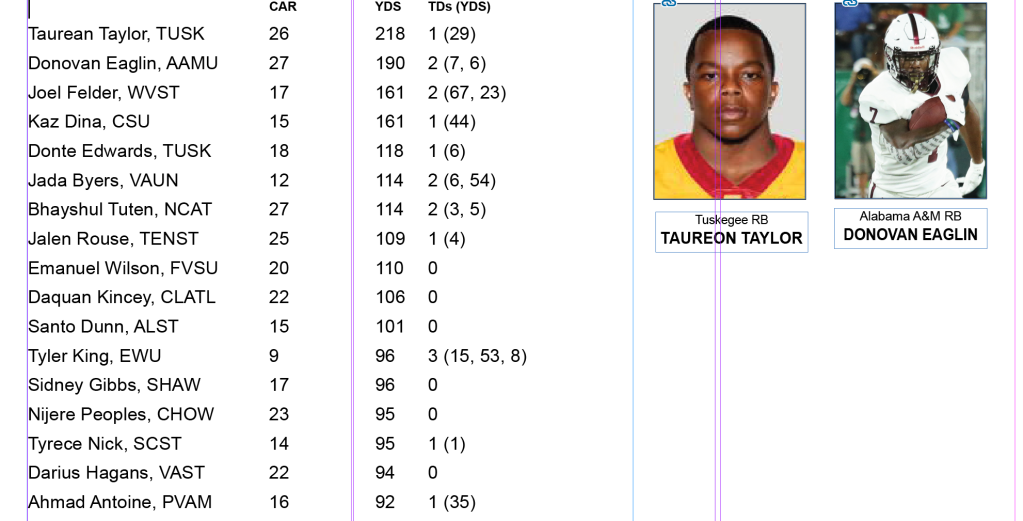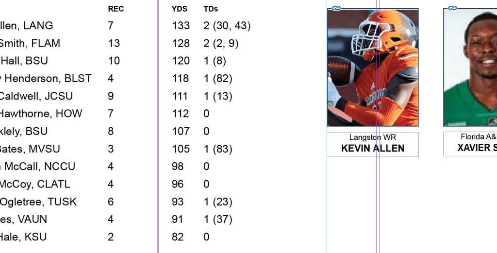 Langston junior Kevin Allen and Florida A&M senior Xavier Smith led the catch parade this week in receptions, receiving yards and touchdowns.