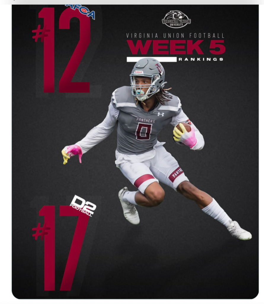 Dr. Alvin Parker’s VUU Panthers (5-0, 3-0 CIAA) are the conference’s only undefeated team. VUU is currently ranked 12th in the AFCA NCAA Div. II Coaches Poll and 17th in the D2football.com poll.