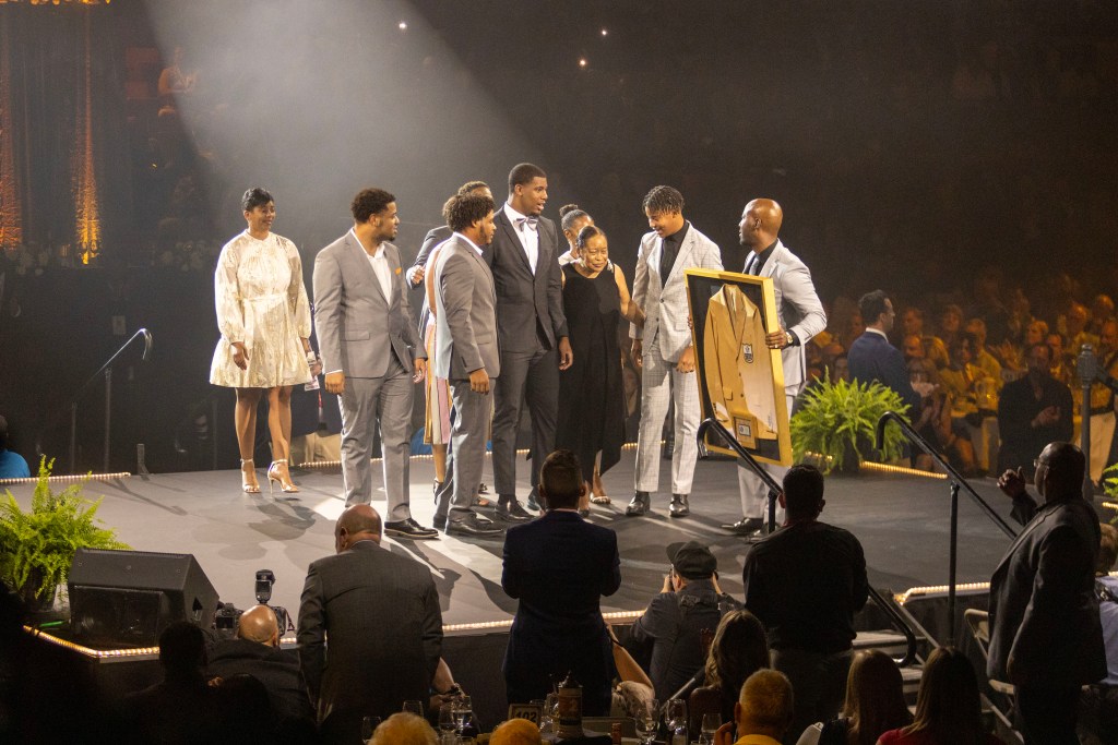 While many are familiar with the enshrinement ceremony, there is literally an entire week of activities leading up to the enshrinement. Friday’s gold jacket ceremony is one of the most important events in the Hall of Fame week. 106 current Hall of Famers were present. It was a Who’s Who of professional football. Peyton Manning, Warren Sapp, Kellen Winslow, Ray Lewis, Jimmy Johnson, Jerry Jones, Calvin Johnson, Tony Dorsett, Emmitt Smith and Jerome Bettis were among those in attendance. Former B-CU great Larry Little was also in attendance. While the living players had the opportunity to be “coated” by the person of their choice, deceased players like Riley and Don Coryell had their jackets presented to the family in a shadow box.
