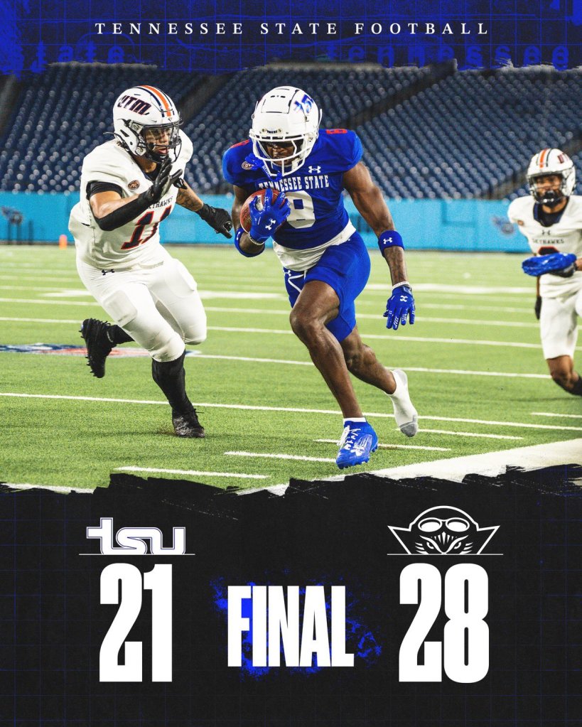NASHVILLE — Draylen Ellis threw for 312 yards and Jalal Dean churned out 118 receiving yards, but HBCU Tennessee State fell to OVC-Big South conference foe UT Martin 28-21 at Nissan Stadium Saturday night. TSU drops to 6-3 overall and 3-2 in conference matchups.