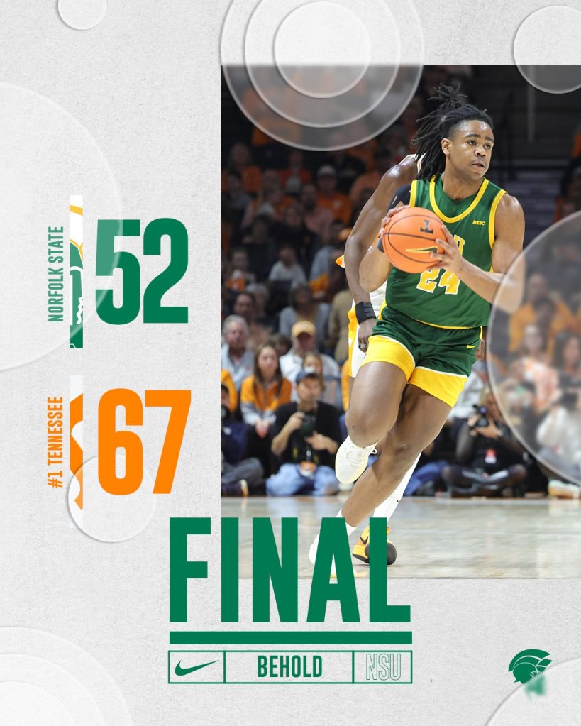 KNOXVILLE, Tenn. – The Norfolk State men’s basketball team held its own for 40 minutes against the top-ranked team in the nation on Tuesday afternoon, as the HBCU fell 67-52 to the No. 1 Tennessee Volunteers at the Food City Center.