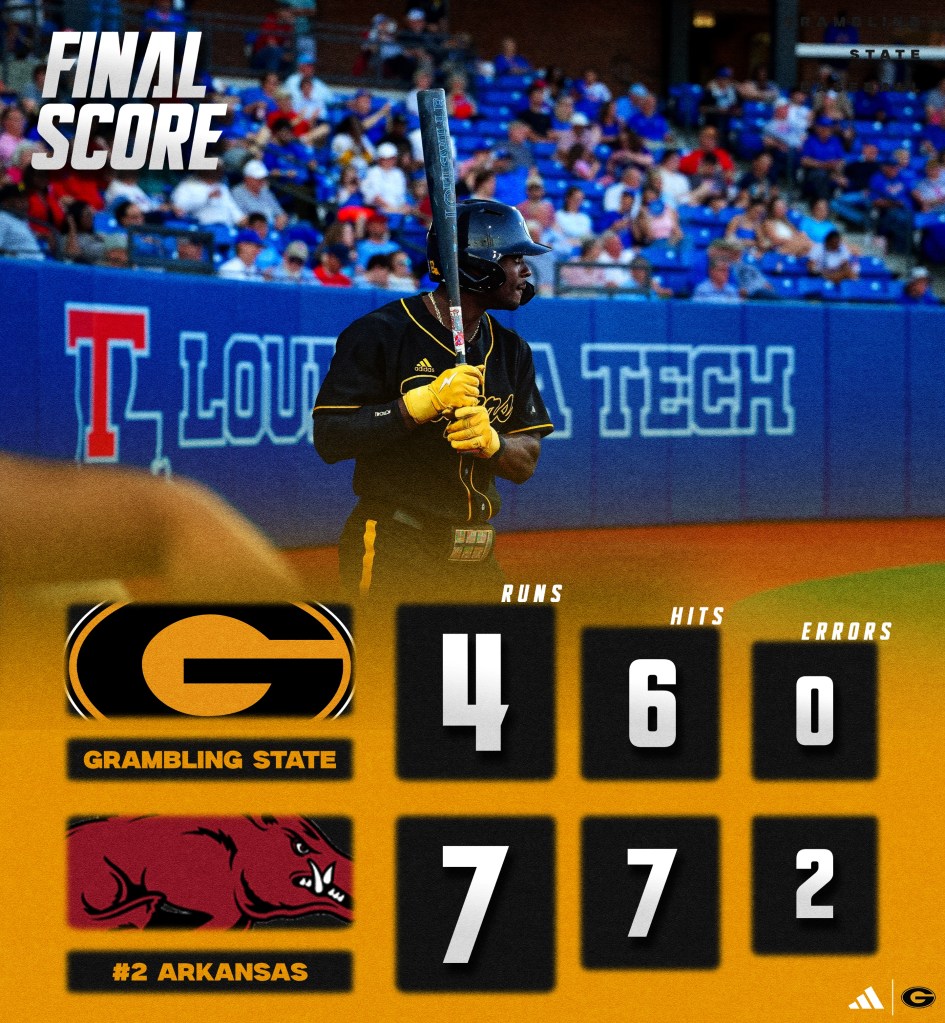 NORTH LITTLE ROCK, Ark. | The Grambling State University baseball team put up a valiant effort against second-ranked Arkansas, falling 7-4 on Tuesday night at Dickey-Stephens Park in North Little Rock, Ark. The HBCU baseball squad (10-17) registered six hits in the contest while UA (27-3) picked up seven hits and committed two errors.