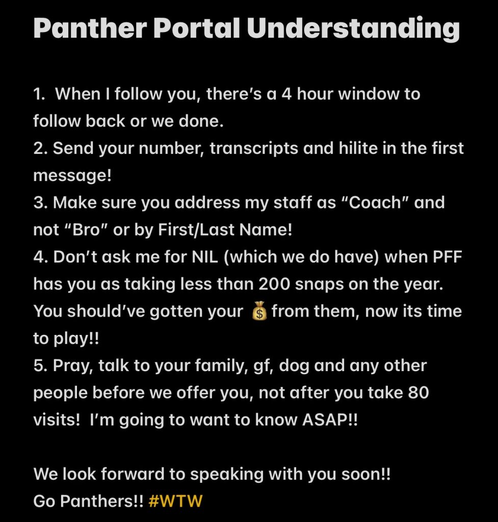 “When I follow you, there’s a 4 hour window to follow back or we done,” reads rule No. 1. The rest of the post — titled “Panther Portal Understanding” — makes it clear that professionalism, preparation, and respect are non-negotiables for any transfer looking to join the HBCU program.
