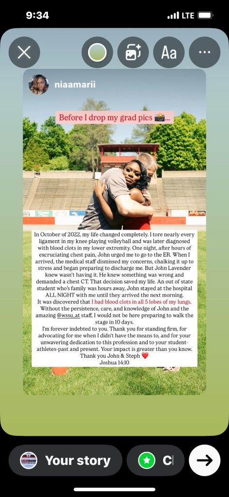 Nia James, a senior and former member of the WSSU volleyball team, shared an emotional story of survival and gratitude directed at John Lavender, the university’s longtime athletic trainer. In a touching social media post, she credited Lavender with saving her life following a near-fatal health scare in October 2022.