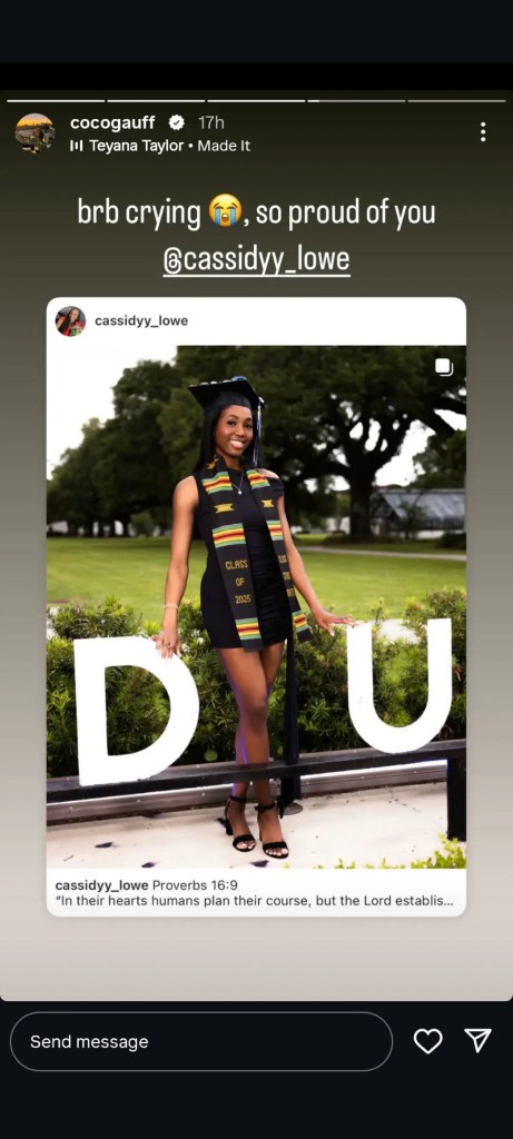 On Instagram, Gauff reshared a photo of Cassidy standing in front of a Dillard University sign, clad in her graduation cap and a scarf that proudly read “Black Grads Matter.” The post included a verse from Proverbs 16:9: “In their hearts humans plan their course, but the Lord establishes their steps.” Gauff, visibly moved, captioned her repost: “brb crying, so proud of you, Cassidy Lowe.”