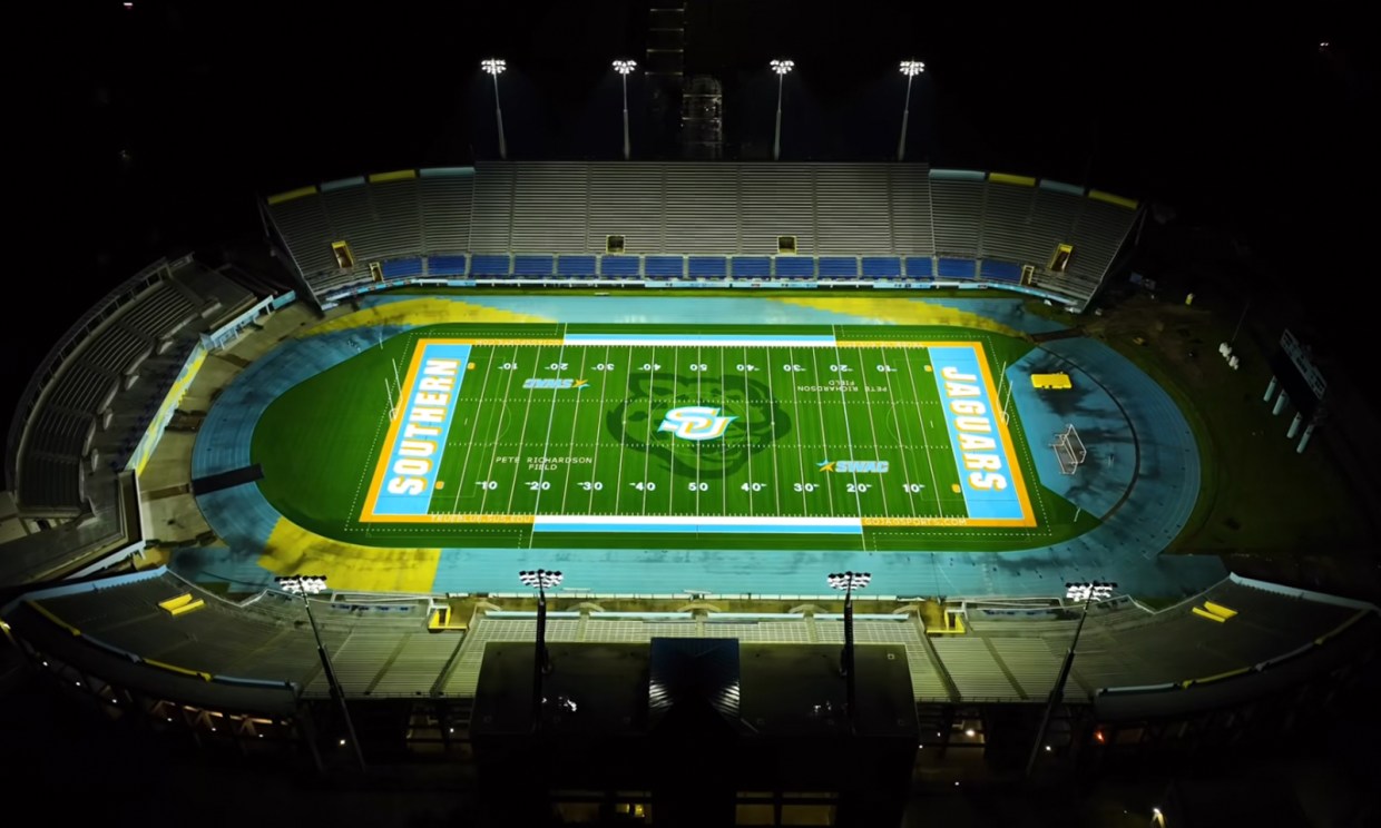 The HBCU recently pulled the cover off its renovated turf. Now, a fresh stretch of bright green with “Southern Jaguars” splashed in white, gold, and Columbia Blue on each end zone. Across midfield, “Pete Richardson Field” pays homage to the Hall of Fame coach who helped turn the Jags into a SWAC powerhouse.