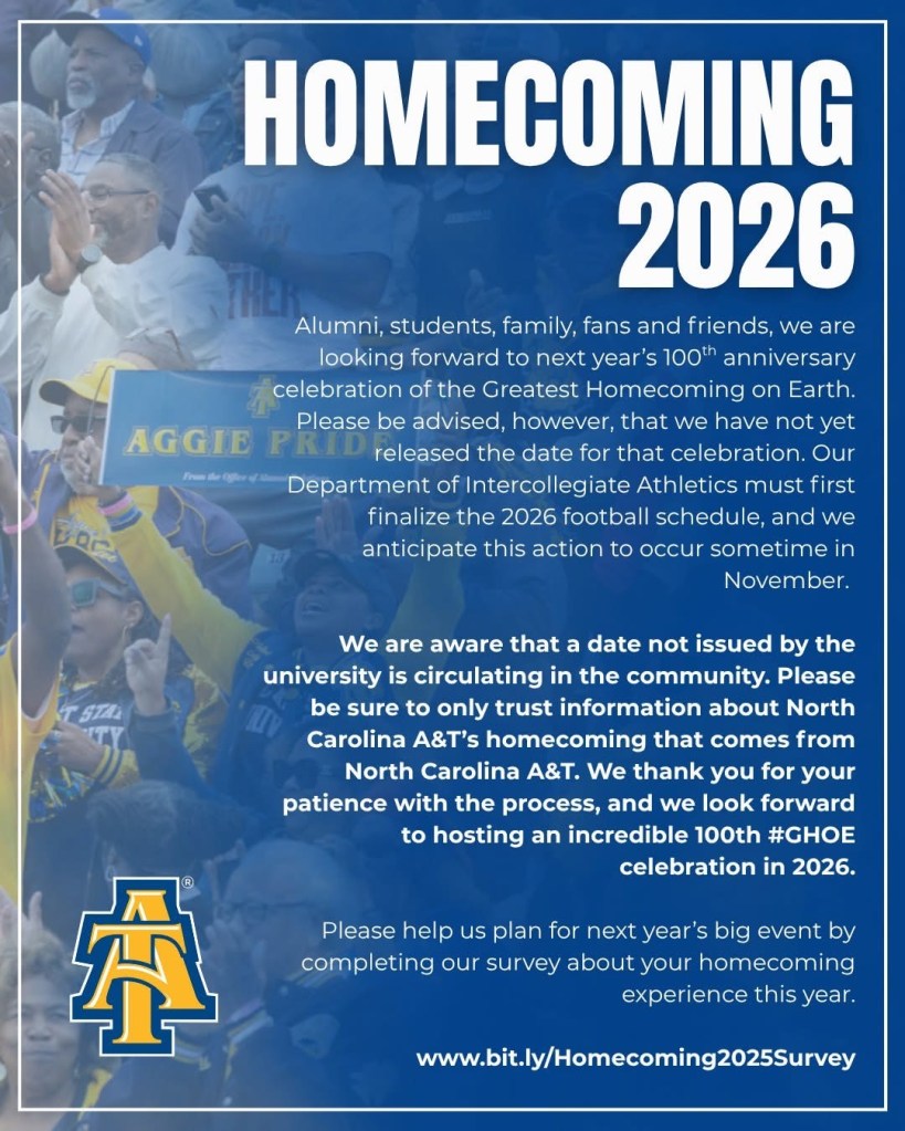 As North Carolina A&T prepares for this milestone event, the university is encouraging Aggies everywhere to help shape the experience. It is requesting participation in a post-event survey about this year’s homecoming. Feedback will help the school plan for a once-in-a-lifetime 2026 GHOE. That celebration will honor a century of Aggie excellence and community spirit.